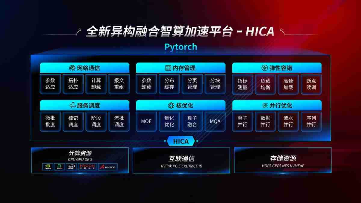 通过自研的服务层、、、、中间适配层、、以及调度编排算法,,采用数据并行、、、模型并行等多种并行方式,,,,把并行计算任务进行有效的分解,,,使其分别由相应的软件栈和算力资源来承接。。。。当GPU资源变化,,,HICA可以实时动态调度计算子任务并调整模型拓扑和架构,,,以充分聚合各种算力资源。。