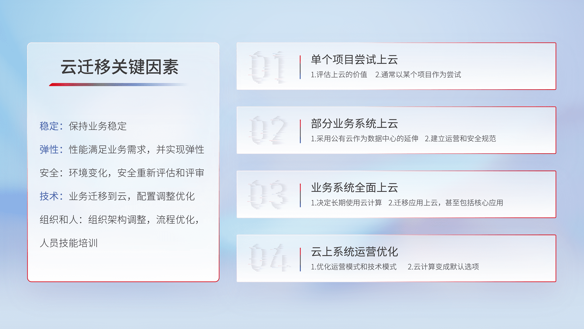 结合实际业务,,从规划设计、、、云平台选型、、、、云原生改造、、、、数据迁移、、、、集成交付,,迁移全过程为客户识别最佳上云路径,,做好风险识别管理,,,设计网络架构、、身份权限、、安全审计合规、、操作审计、、日志审计、、监控告警策略、、多站点容灾设计等,,,,对云上基础设施进行整体规划,,,提升IT治理水平,,,以满足弹性、、高可用、、高性能的需求。。